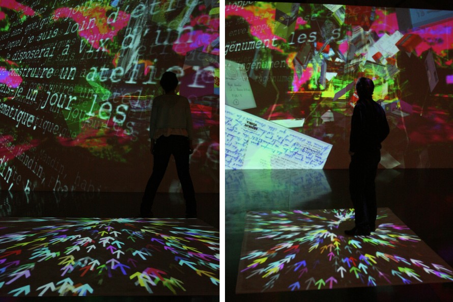 In the last showroom, visitors are in front of a large screen on which is projected a heap of letters, postcards, archives from the museum and packets, arranged here and there. The hundreds of virtual letters fly away and scatter when the visitor moves on an interactive floor. According to their movements, the letters or postcards make larger and bigger up to become readable. When spectators/actors go out from the interactive floor, the letters fall on different way, reflecting the perpetual renewal of the installation. “Letters in the air” shows a portrait of the correspondence which connects all and the evolution from handwritten letter to email.