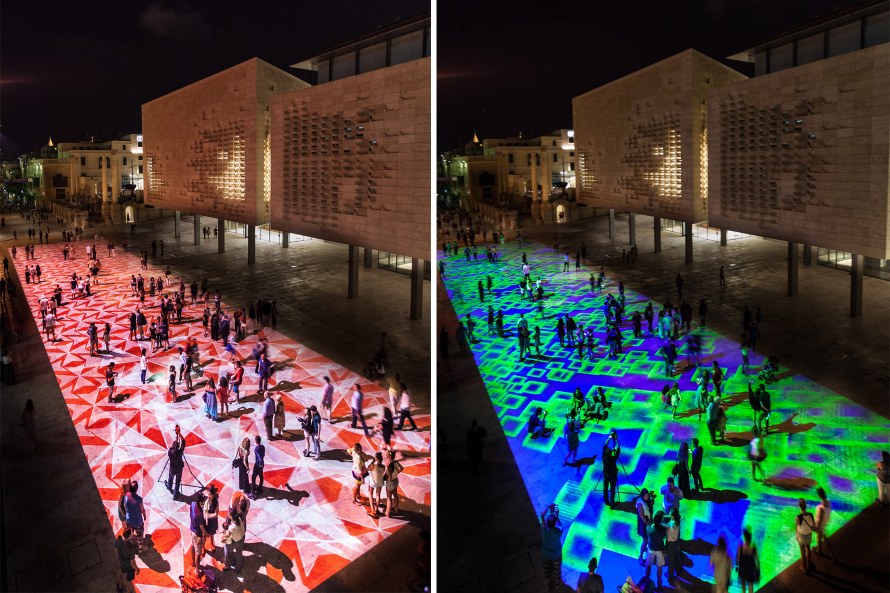 «Pixels Wave” is a giant light carpet that fill the floor of Republic Street at City Gate, in front of Malta’s New Parliament Building designed by the architect Renzo Piano. Various “multicolored graphic scenes,” following one upon another in random fashion, that are composed of such symbolic motifs from the digital universe as pixels, 0s and 1s (symbolic representations of binary code), Wi-Fi, Bluetooth, etc. «Pixels Wave” also incorporates fragments of Malta’s history, for example the Maltese cross. This fluid universe reacts to the motion of visitors. Their movements amplify the pixel distortions under their feet. Through the digital prism, these patterns expand to an urban scale, come alive, form and deform to infinity, and evolve to create an ever-changing universe.