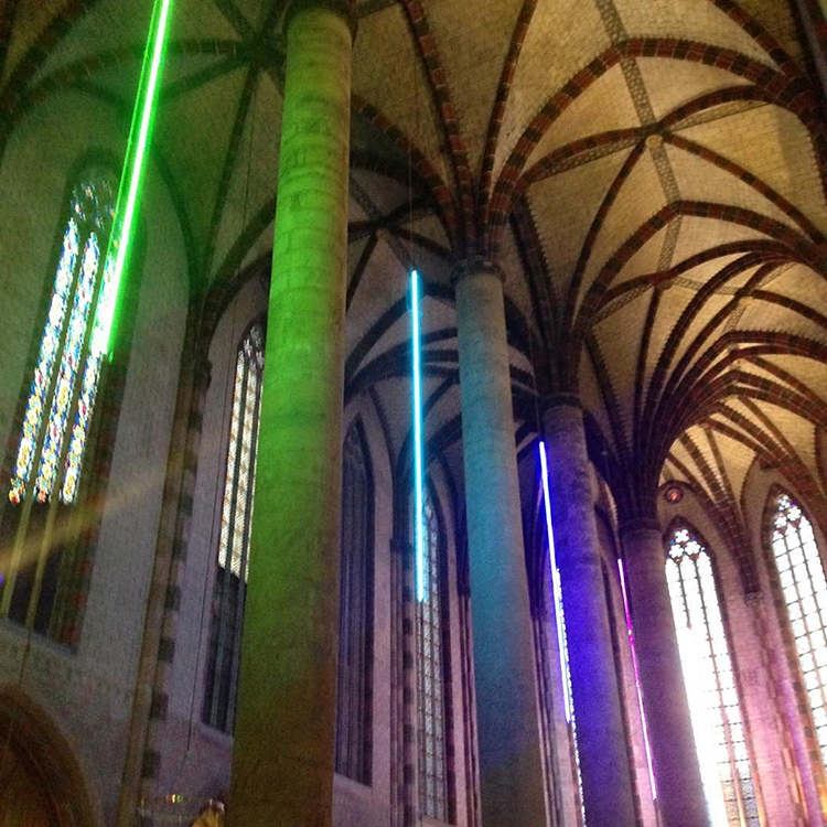 A long thin neon tube made of crystal hangs in each of the colonnade's seven intervals. Each tube is one of the seven colours of the rainbow. In the choir stands the column from which the twenty-two ribbed arcs that form the “palm tree” burst out. This is where the artist has suspended a sheaf of seven neon tubes that bring together the seven colours. This sheaf lights up and turns off to the beat of calm breathing. Thus Sarkis unravels the procession of colours that state light in all its metaphors throughout his separation plan: life, joy, diversity, conciliation, ascension. This retrieved plane of moral and spiritual elevation makes its imprint to a soundtrack created with musician Jacopo Baboni Schilingi. It gently plays outside noises, ordinary noises of shared life, sounds of weather patterns, of time going by; a whole murmur of the outside world, at our feet in the choir. It slips its repetitions and discrepancies in between the visitors and the sounds of real time, between the material and spiritual worlds. What size to give the luminous tubes that rhythm the nave? Sarkis chose the “cane of Toulouse” – a measuring stick roughly equal to six feet, a multiple of the unit of measure in use at the time the church was built. The work is titled Mesure de la lumière, and that is what it does: it measures the place as well as the light. Hence the knotted ropes that hang alongside the tubes and measure their length. We can see that Sarkis experiences this exceptional monument with the humility of the respect it inspires in him and the empathy it stirs in him. The past cannot pass when artists bring it to the present.